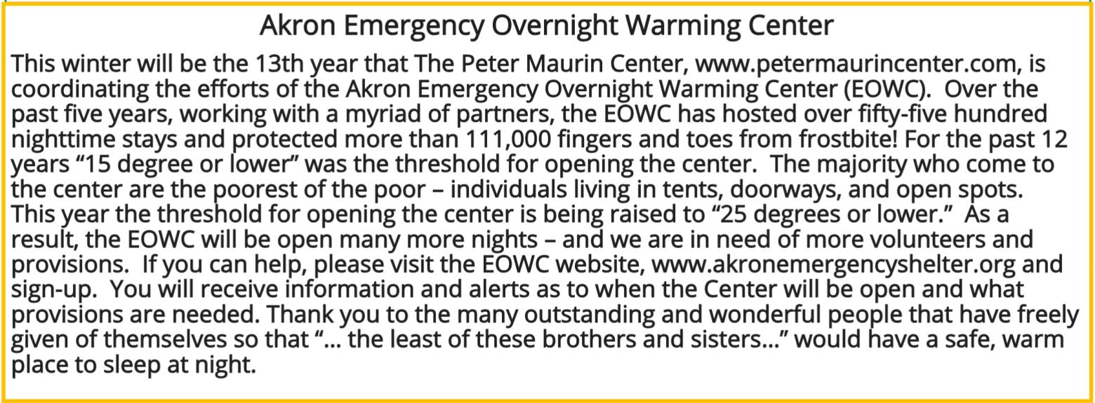The One Church service will will held at St. Bernard's Parish: 44 University Ave, Akron, OH 44308
